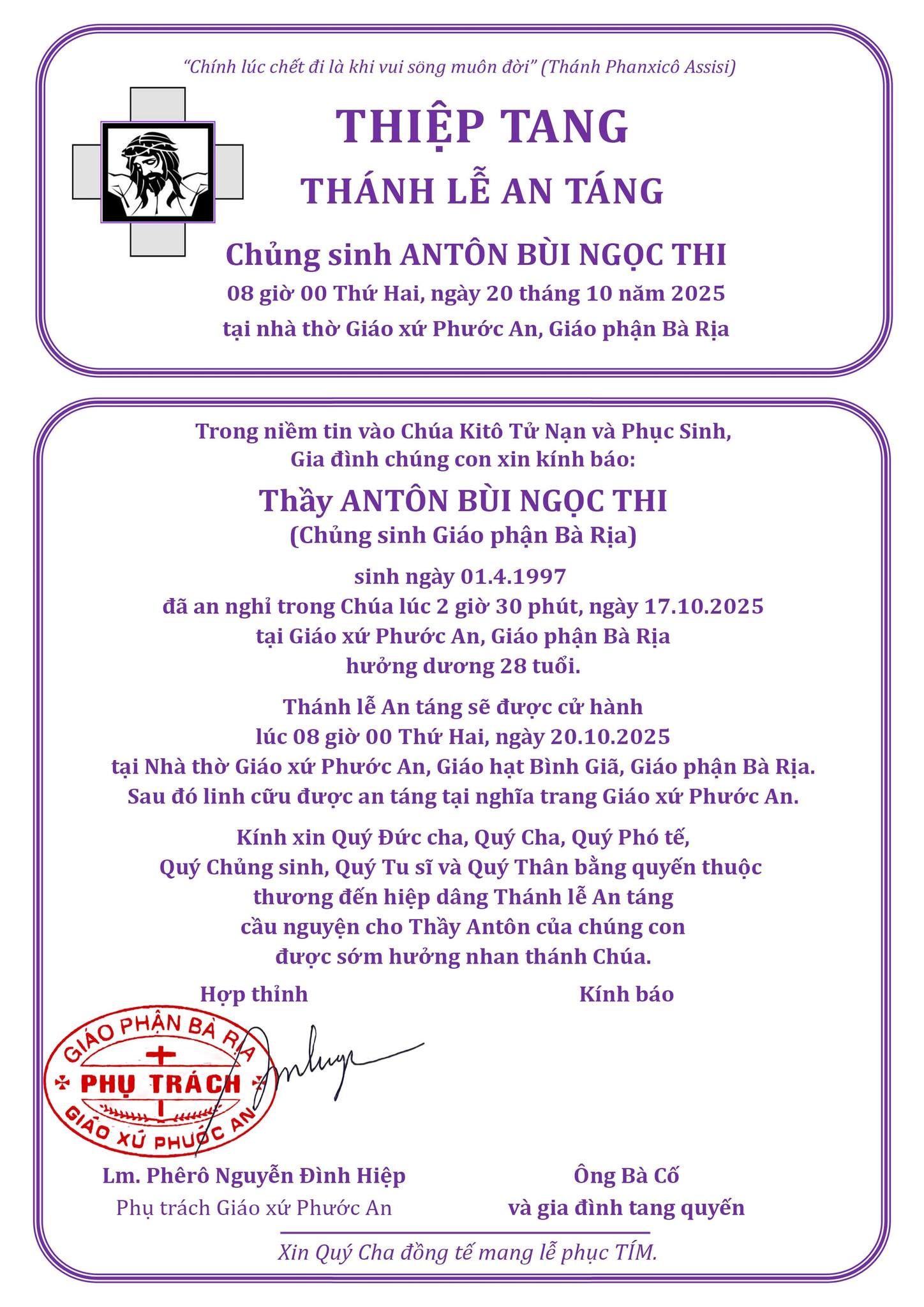 Ai Tín – Chủng sinh Antôn Bùi Ngọc Thi Facebook Google+ Twitter Email Bản Tin, Chủng Sinh Các Khóa, Chủng Viện, Đại Chủng Viện Thánh Giuse Xuân Lộc, Khóa XVII Nguồn: AI TÍN: Chủng sinh ANTÔN BÙI NGỌC THI (Giáo xứ Phước An – Giáo phận Bà Rịa) qua đời | Giáo Phận Bà Rịa Facebook